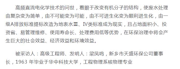 中國高新技術網發布:《關注:解碼科技創新》——新鄉市天盛環?!俺瑥娧趸€原廢水處理技術”