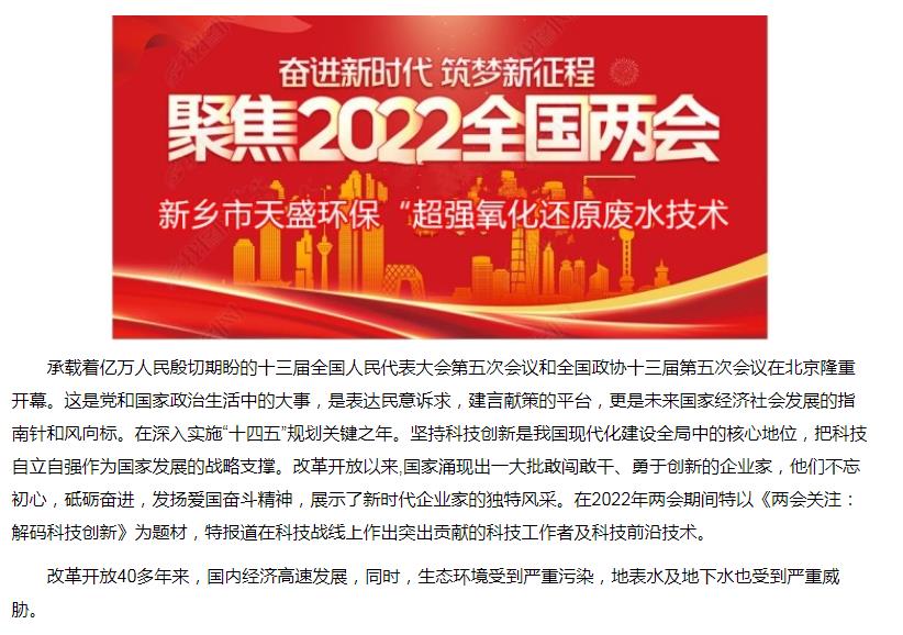 中國高新技術網(wǎng)發(fā)布:《關注:解碼科技創(chuàng)新》——新鄉(xiāng)市天盛環(huán)保“超強氧化還原廢水處理技術”